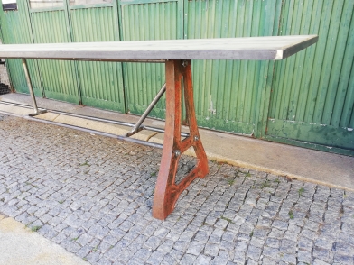 Mesa comunitária com pés em ferro funido vintage e tampo em madeira reciclada.