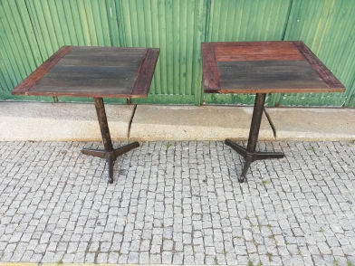 Mesa de café com pé em ferro e tampo em madeira de deck.