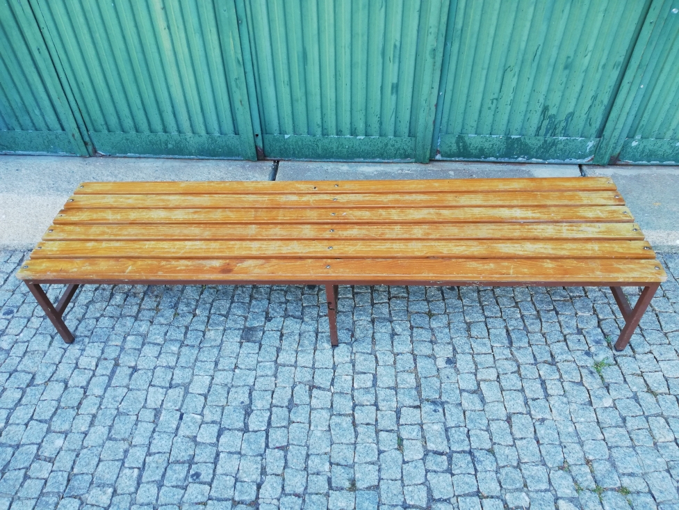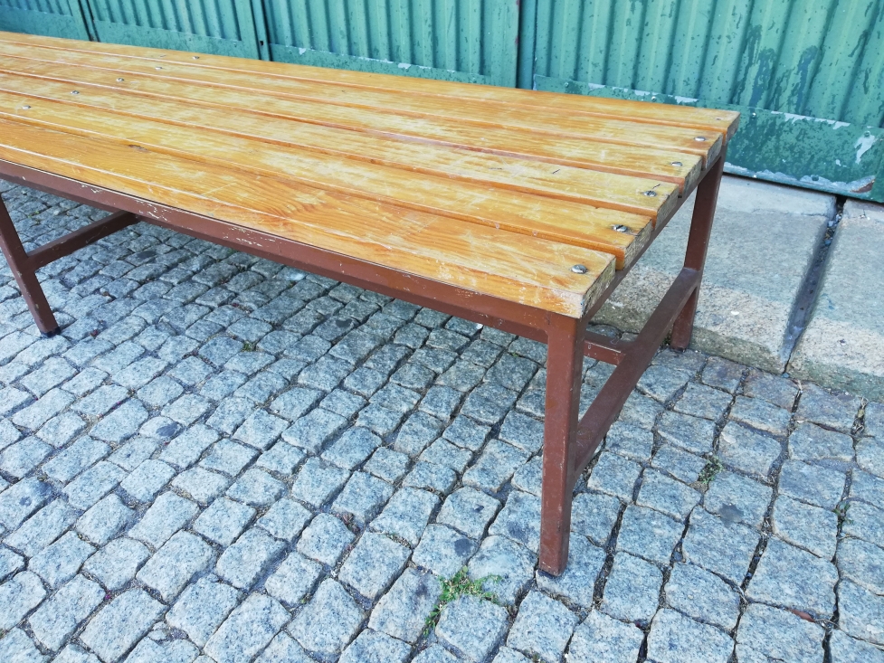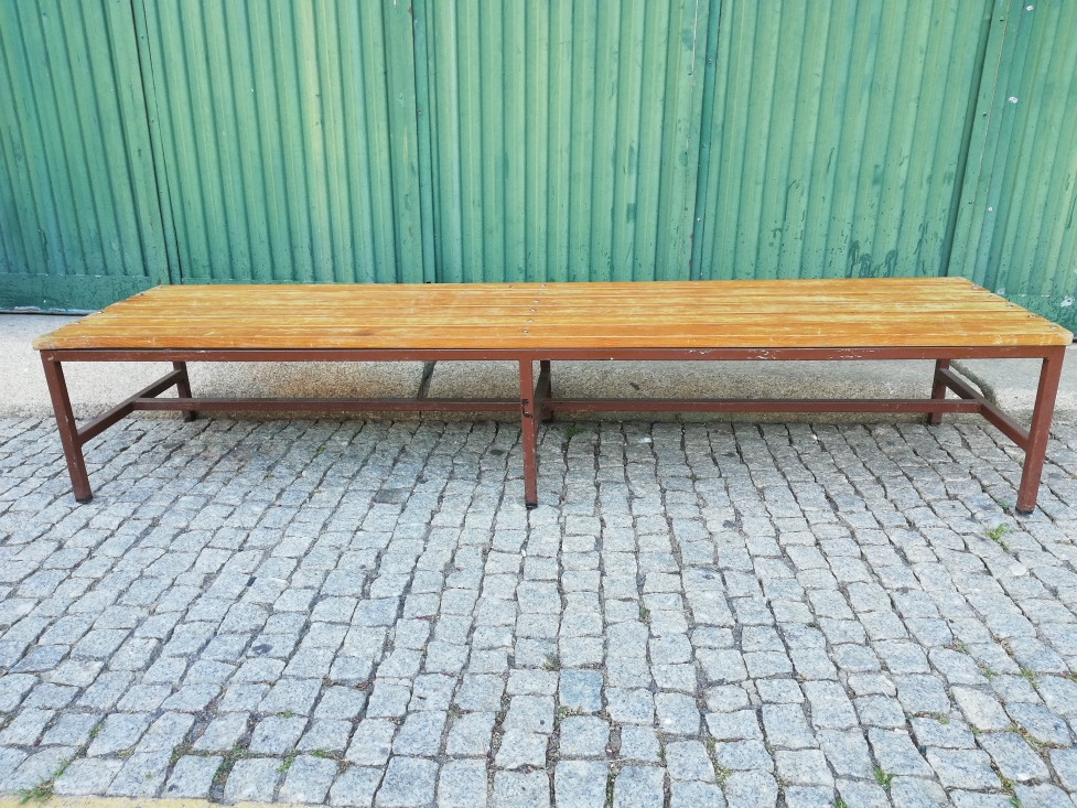 Mesa de apoio em madeira ripada, antigos bancos de ginásio escolar dos anos 60.