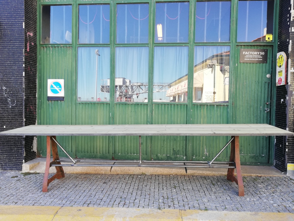 Mesa comunitária com pés em ferro funido vintage e tampo em madeira reciclada.