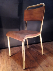 Cadeira de hospital em metal. Estrutura tubular metálica com assento e encosto em madeira maciça. Patina original