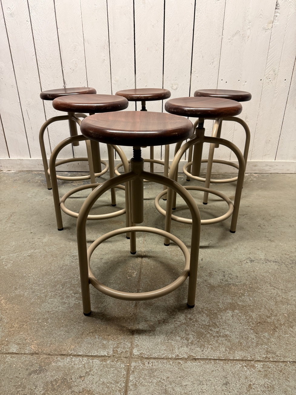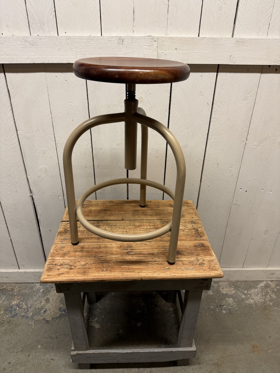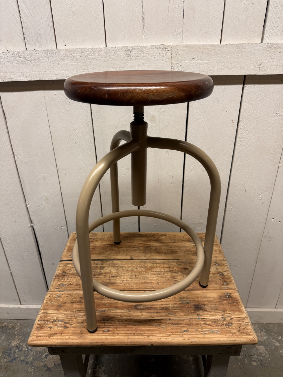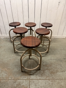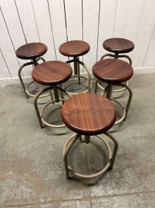 Bancos de rosca em ferro com assento em madeira, provenientes de um antigo laboratório.