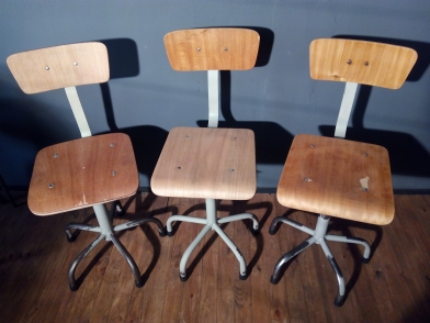 Cadeiras de operária fabril provenientes de uma antiga fabrica de calçado. Estrutura tubular metálica, com assento regulável em altura. Assento e encosto em contraplacado de madeira de faia. Patina original