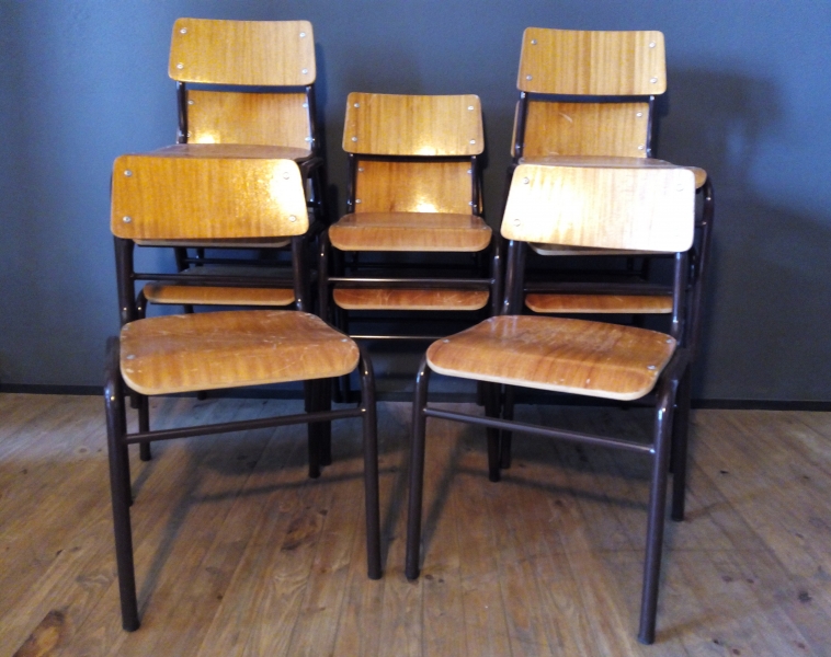 Cadeiras escolares provenientes de uma antiga escola portuguesa. Estrutura tubular metálica pintada em castanho e assento e encosto em contraplacado de madeira de faia. Patina original. Preço unitário.